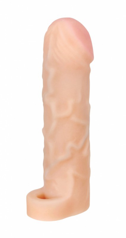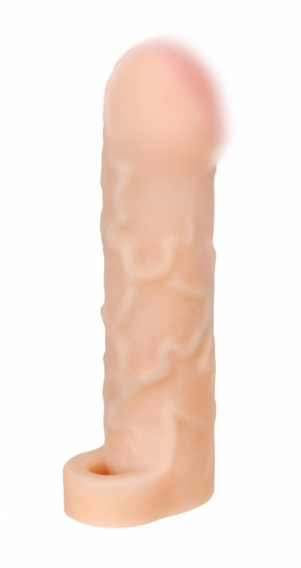 Сама насадка выпол­нена из потря­сающего мате­ри­ала нового поко­ле­ния - неоскин. Мяг­кий, неж­ный, подат­ли­вый мате­риал гаран­ти­рует самые реа­ли­стич­ные ощуще­ния! А, выпук­лые венки и ярко выражен­ная уве­ли­чен­ная головка  дарят допол­ни­тель­ную стиму­ляцию! Петелька-​эрекционное кольцо обес­пе­чи­вает надеж­ную фик­сацию насадки, и кроме того, про­дле­вает муж­чине время поло­вого акта!